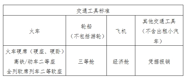 第八條 出差人員按規定等級乘坐交通工具,未按規定等級乘坐交通工具的,超支部分由個人自理。乘坐交通工具的等級見下表: